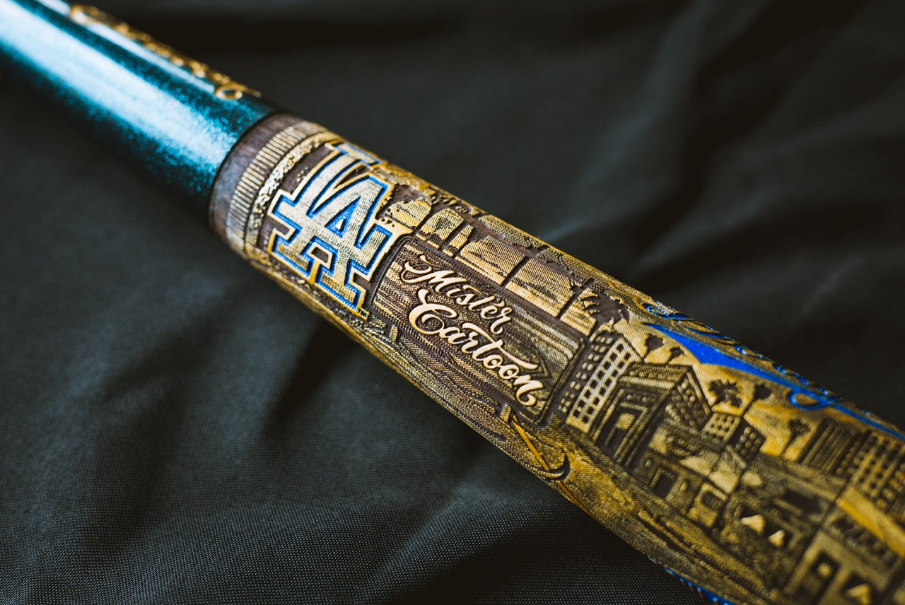 The premium Gold Edition World Series version of the Mister Cartoon mural bat features hand-painted spot colors throughout the mural design and custom metallic flake paint on the handle keeping true to the custom work of Mister Cartoon's automotive paint jobs.