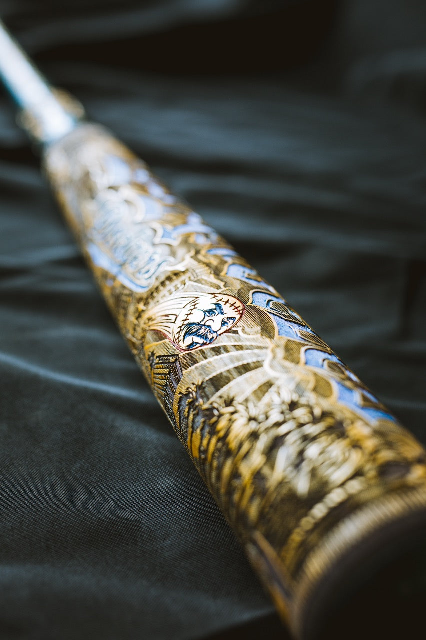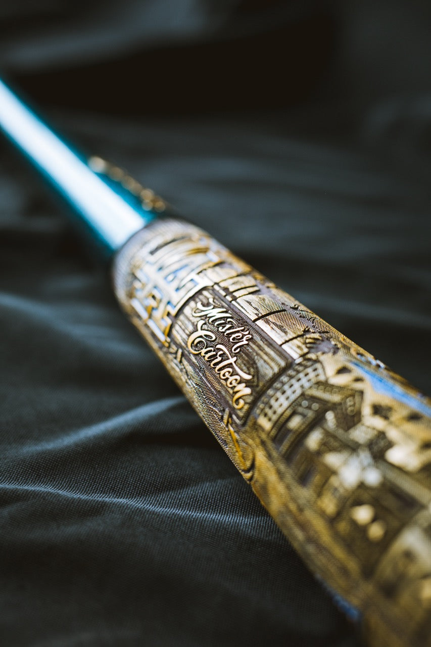The premium Gold Edition World Series version of the Mister Cartoon mural bat features hand-painted spot colors throughout the mural design and custom metallic flake paint on the handle keeping true to the custom work of Mister Cartoon's automotive paint jobs.