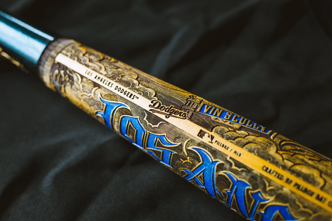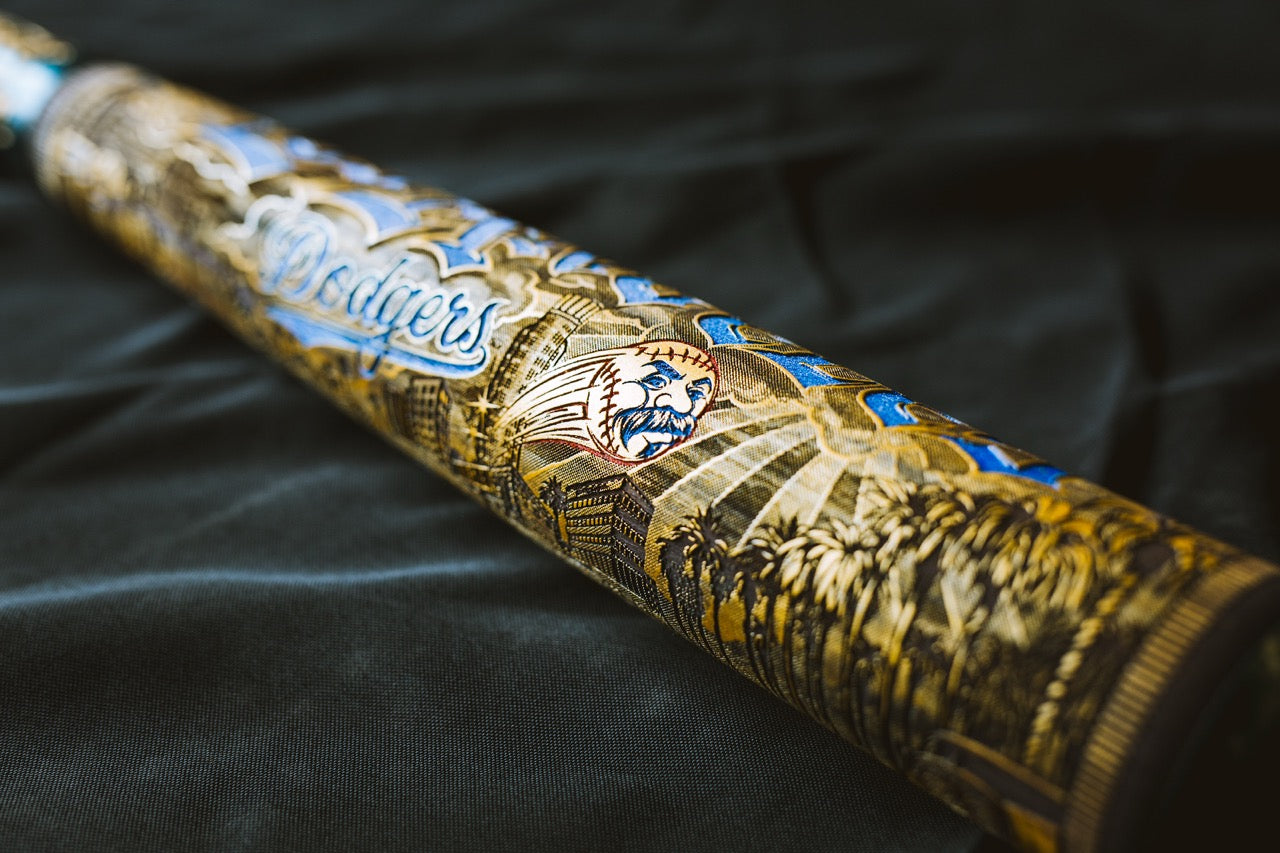 The Mister Cartoon artist series is truly a work of art. Designed originally as a mural that graces the Dodger stadium, we worked closely with Mister Cartoon to translate it onto a collector bat. Each is turned, hand-painted and laser engraved to perfection in the Pillbox shop.Every Pillbox bat is crafted at our shop in Winona, Minnesota. Each bat in 'The Mural Series' is crafted of high-quality maple, 34" long, laser engraved, and has the signature Pillbox logo pin inlaid into the knob.